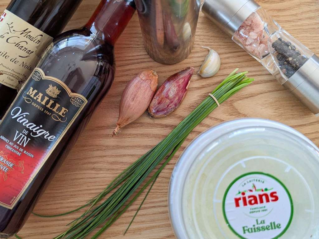 フロマージュ・ブランにみじん切りのハーブ類を混ぜて、オリーブオイルとワインビネガーと調味料で味をととのえるだけ。そして冷蔵庫で冷やしてなじませる。家庭料理だし、材料の分量はお好みで調整してね。