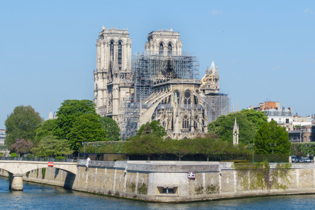 ところで、皆さんご存知の通り、この散策の数日前に起きたノートルダム大聖堂の火災は衝撃的でしたね。やはりこれは見ておこうと思い、シテ島方面へ。ただし大聖堂には近づけないので、セーヌ川の対岸から眺める感じになるんだけど…やはりあの直後の週末だから、聖堂を眺められる場所のあちこちに人がいっぱい。橋の上にはマスコミ関係者たちも。